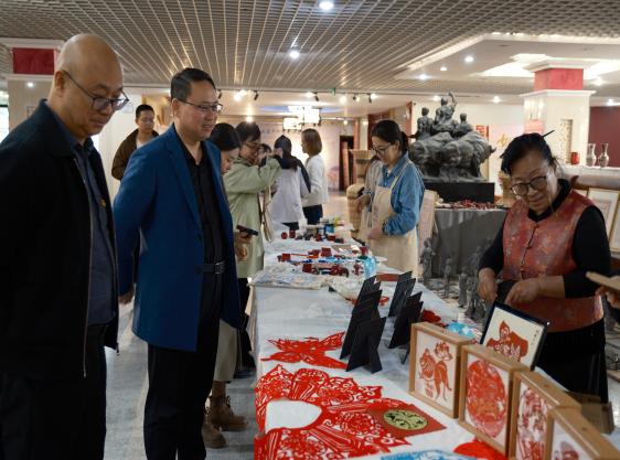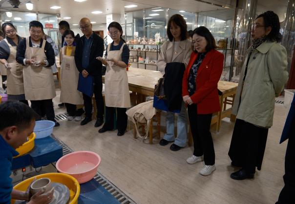 互动环节中,非遗文化体验内容丰富、精彩纷呈。退休教师侯瑞云现场展示剪纸技艺,以生肖为主题创作作品并现场赠送,用传统艺术传递美好祝福;美术与设计系武燕老师带领大家在环保袋上制作维吾尔族模戳印花,传递简约之美、传统之美与环保之美;非遗中心主任杨超带领大家体验陶罐拉坯、捏塑制作,感受陶艺独特魅力。大家在实践体验中增进交流、凝聚共识。